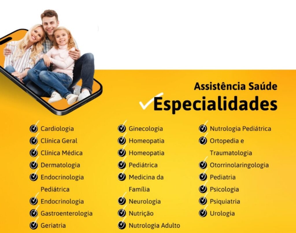 Um atendimento em telemedicina com suporte 24 horas por dia, 7 dias por semana em Assisténcia Saúde e Pscicologia, com agendamento em mais de 21 especialidades.